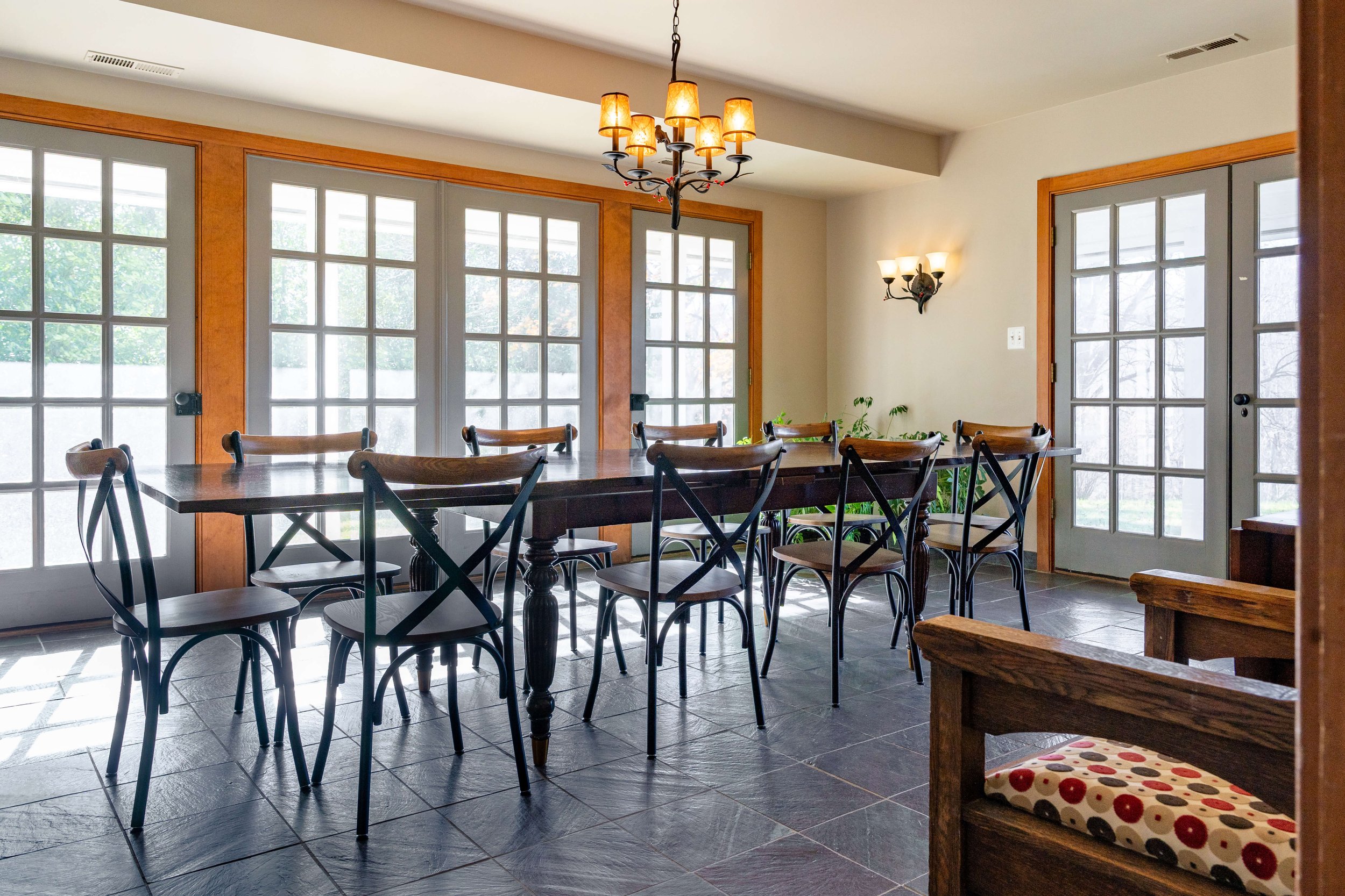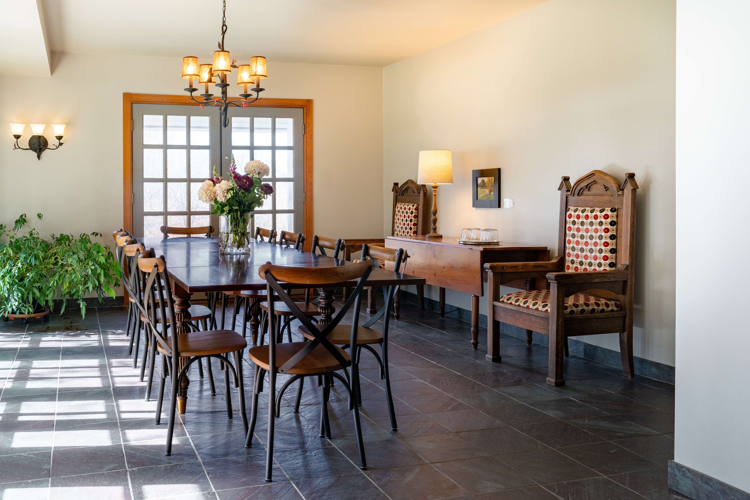 A focal point for Meadowkirk’s evolving farm-to-table experience, the Dining Hall is available for larger multi-purpose guest gatherings (including Wi-Fi/AV), with adjoining courtyard patio and a meadow-overlook screened porch for informal or special gatherings.
